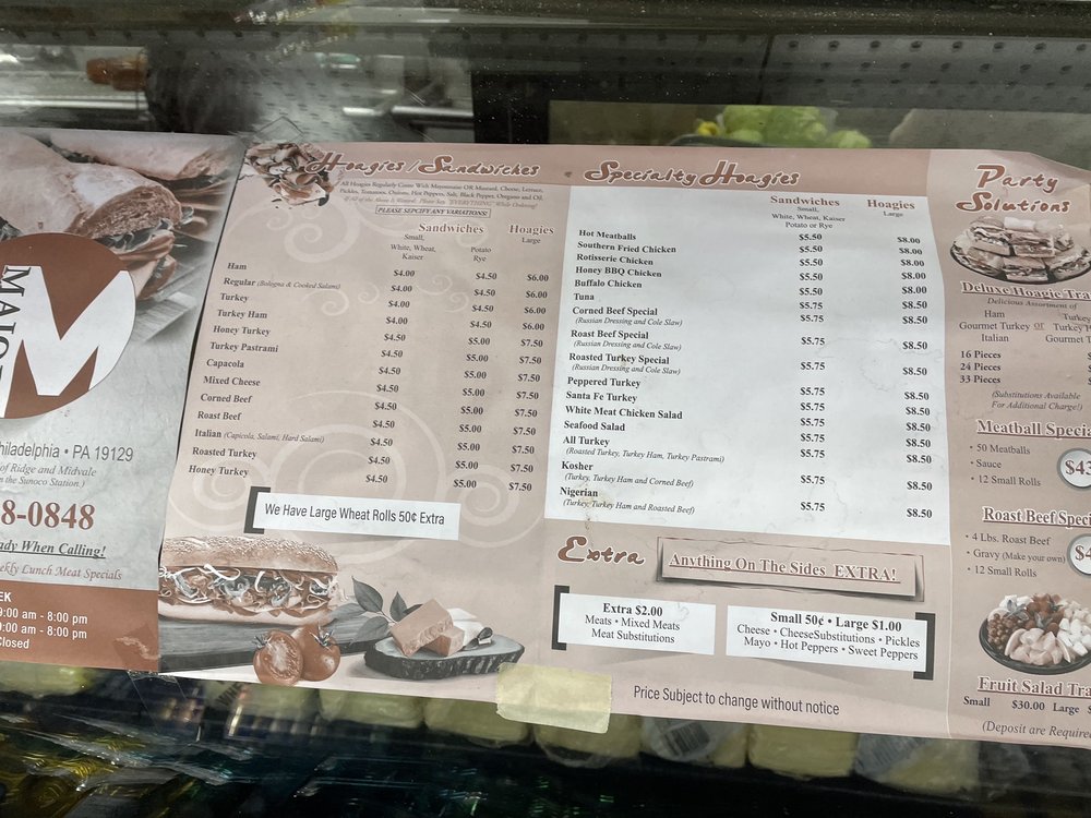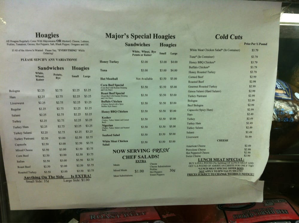 Welcome to Major's, a delightful deli nestled in Philadelphia, PA. Known for their mouthwatering sandwiches and hoagies, Major's offers an array of options at wallet-friendly prices. Customers rave about the Honey Turkey and Seafood Salad, both staying true to freshness and flavor for over a decade. At just $3.25 to $3.75 per sandwich, you'll find that quality meets affordability here.